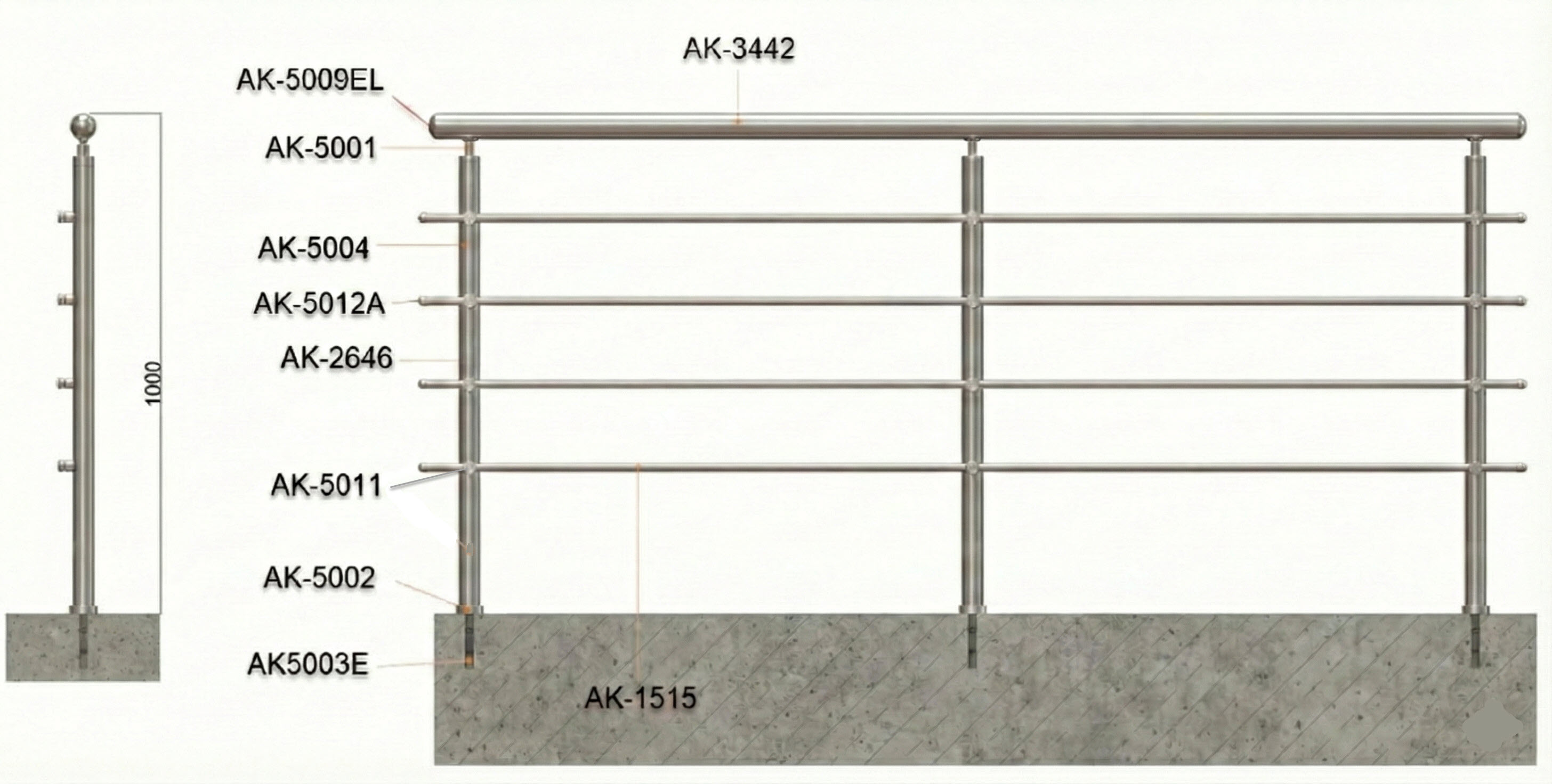 madlo Ø50mm AK-3442, stĺpik Ø40mm AK-2646 (výška stĺpika 950mm), krytka stĺpika AK-5004, priečka AK-1515, spojka madla a stĺpika AK-5001, krytka madla AK-5009EL, krytka priečky AK-5012A, držiak priečky AK-5011, spodná krytka stĺpika AK-5002, kotva AK-5003E, ALEBO pri kotvení do dosky namiesto AK5002 a AK-5003E - príruba na stĺpik s tŕňom AK-5036C a krytka na túto prírubu AK-5036CA.