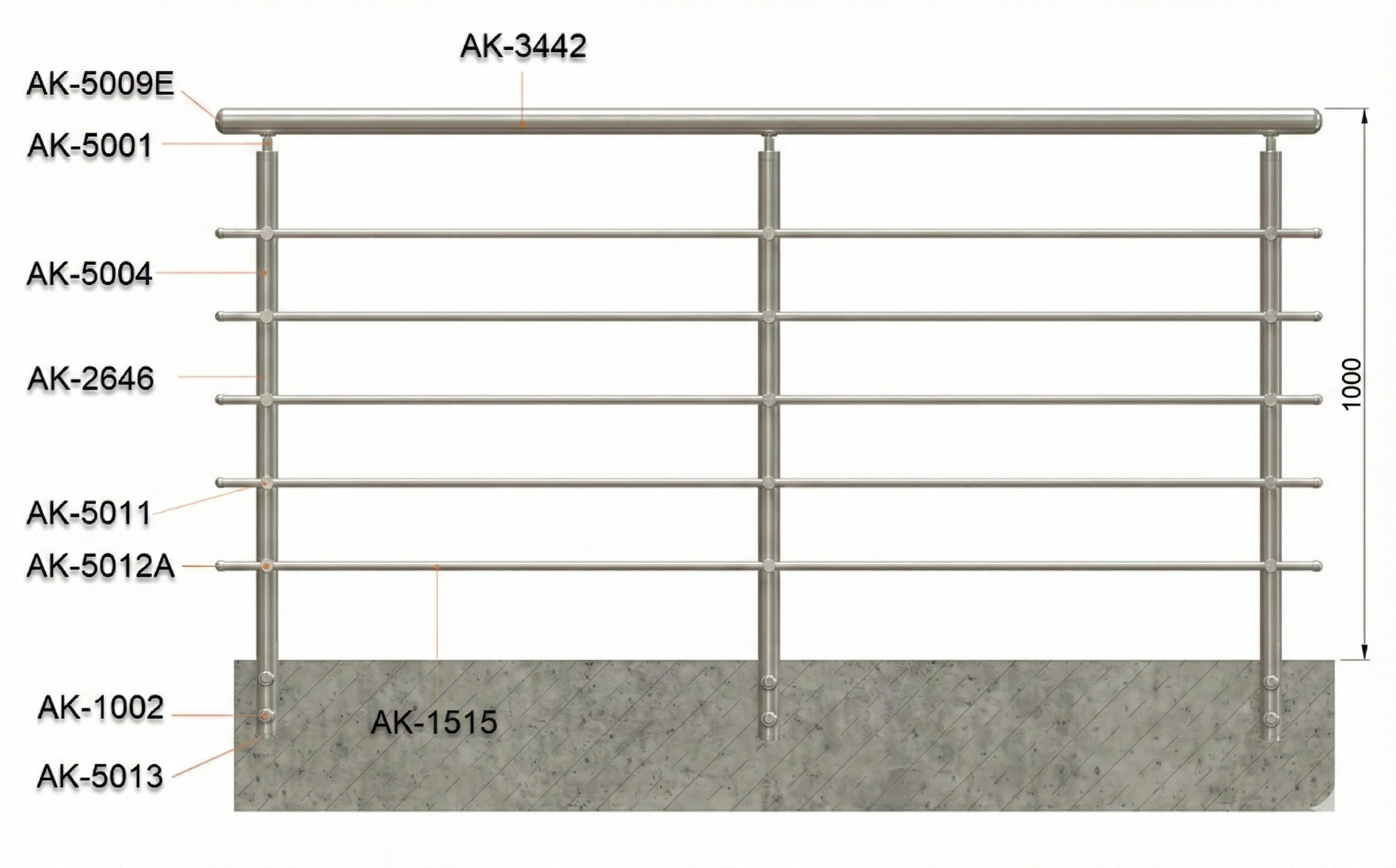 madlo Ø50mm AK-3442, stĺpik Ø40mm AK-2646 (výška stĺpika 1150mm), krytka stĺpika AK-5004, priečka AK-1515, spojka madla a stĺpika AK-5001, krytka madla AK-5009EL, krytka priečky AK-5012A, držiak priečky AK-5011, spodná krytka stĺpika AK-5013, sada komponentov pre bočné kotvenie do steny AK-1002.